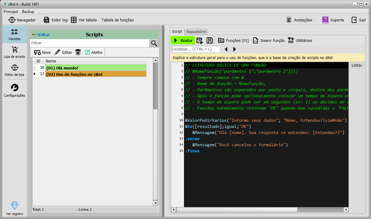 - Os pacotes com scripts gratuitos não fazem parte do licenciamento do zBot e são fornecidos como cortesia. Não há neles garantia de atualização, melhorias ou correções e não há suporte por obrigação para os mesmos;